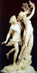 Un día, Apolo la sorprendió escuchando su canto y se quedó enamorado de tal maravilloso susurro. Dafne al notar su presencia deja de cantar y queda inmóvil por el susto, mientras busca con ojos aterrados un escondite a su alrededor. El Dios Apolo la seduce con mágicas palabras de amor, ella le suplica que se detenga pero él es sordo a su ruego, entonces Dafne echa a correr, pero no tiene a donde huir. Indefensa, pide ayuda a la Tierra y ésta le oye; como salvación comienza a transformarse entre los brazos del Dios. Su suave piel se recubre de una corteza, sus uñas delicadas se alargan en hojas multiplicadas con mágica velocidad. Sus cabellos forman un denso ramaje, el rostro desaparece detrás de la corteza y el cuerpo se transforma en tronco.