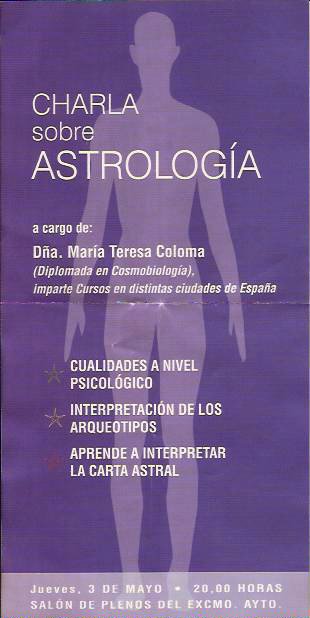 Se trata de una charla sobre astrología, a cargo de una tal Dña. María Teresa Coloma, que es diplomada en Cosmobiología. La charla está organizada, según parece, por el Ayuntamiento de Ibi y se celebrará en el Salón de Plenos.