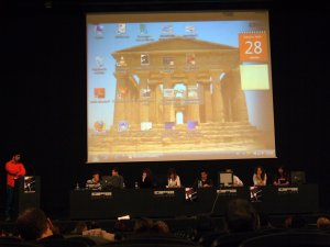 Uno de los participantes expone su trabajo ante el escrutinio reflexivo de sus compañeros.