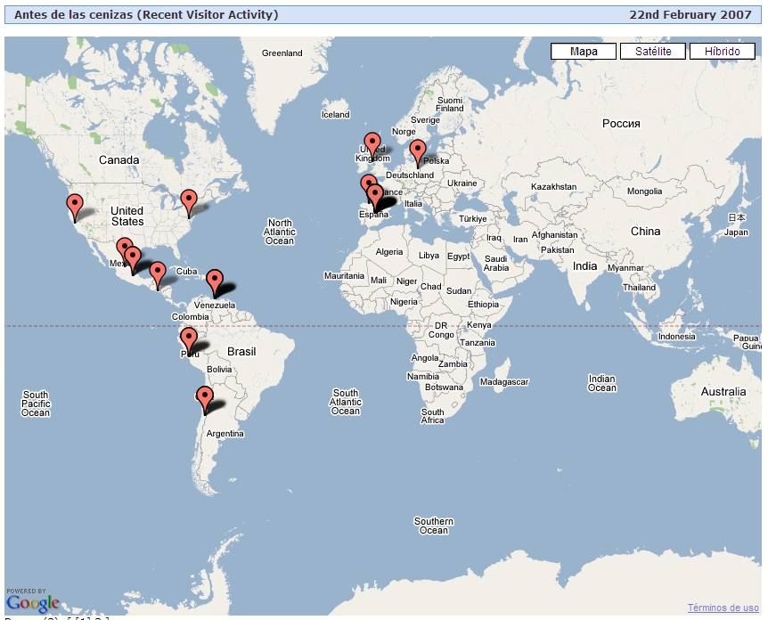 A modo de curiosidad, os paso el mapa de visitas del blog. Las marcas indican los lugares desde los que se ha accedido recientemente a ‘antesdelascenizas’. Me parece increíble que nos visiten desde lugares tan lejanos. En fin, saludos a todos…